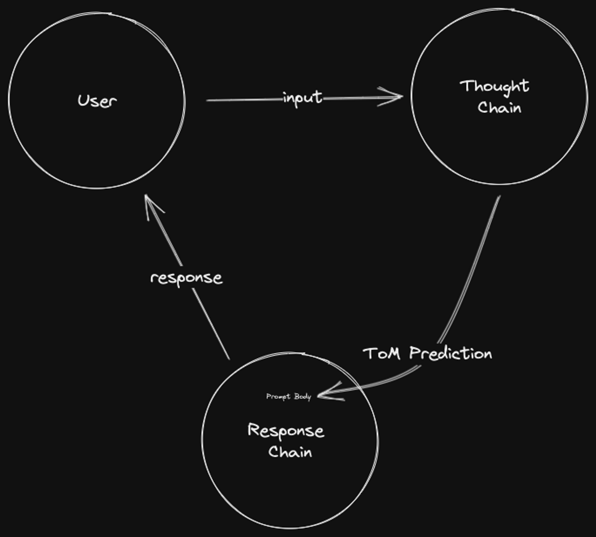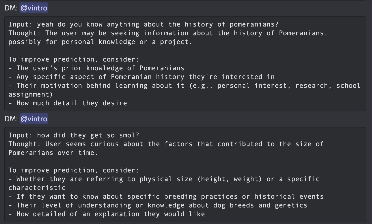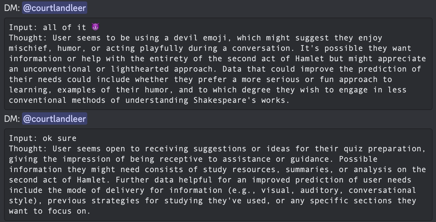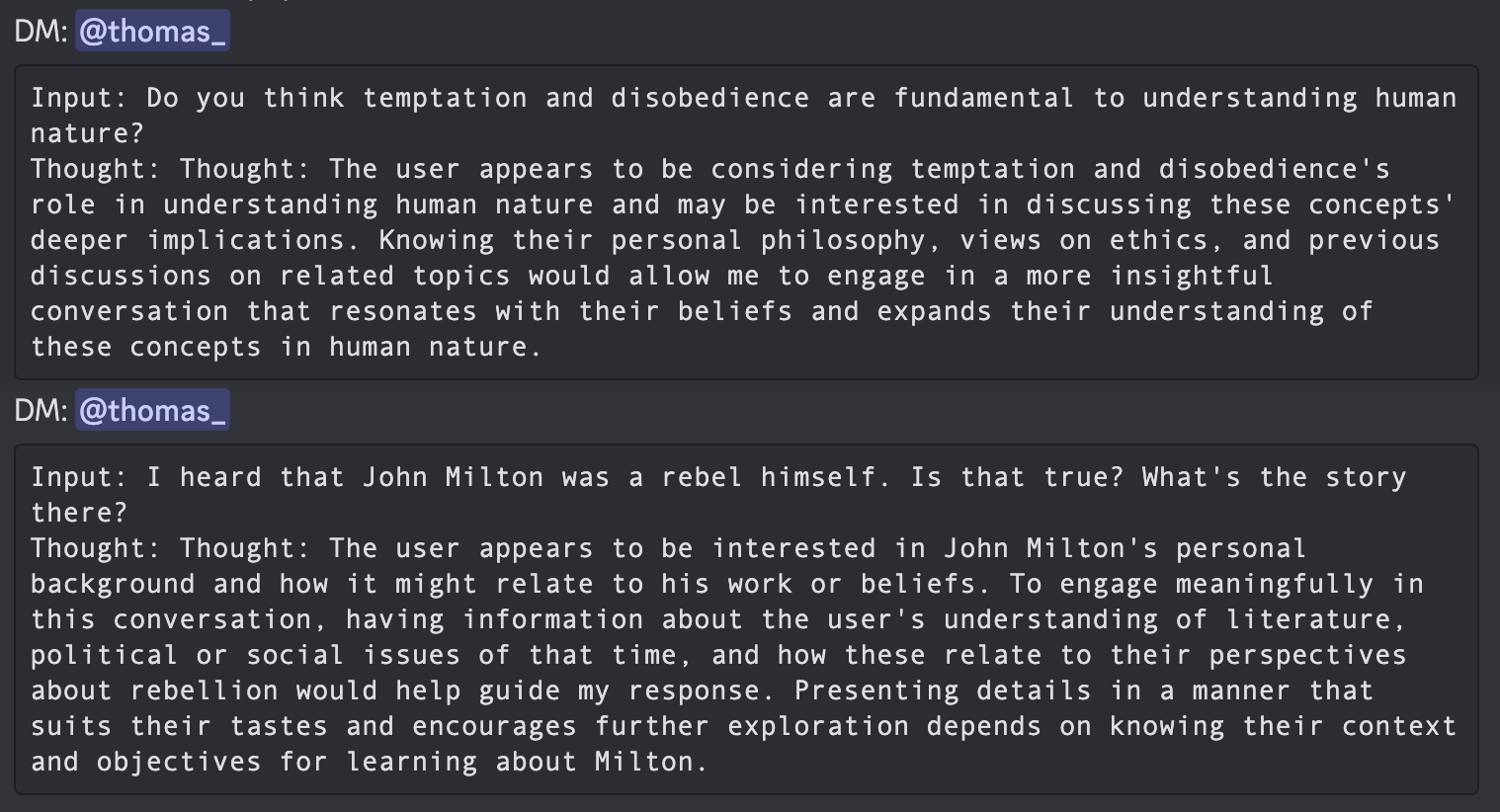 It consists of two “chain” objects from LangChain —a thought and response chain. The thought chain exists to prompt the model to generate a pedagogical thought about the student’s input—e.g. a student’s mental state, learning goals, preferences for the conversation, quality of reasoning, knowledge of the text, etc. The response chain takes that thought and generates a response.