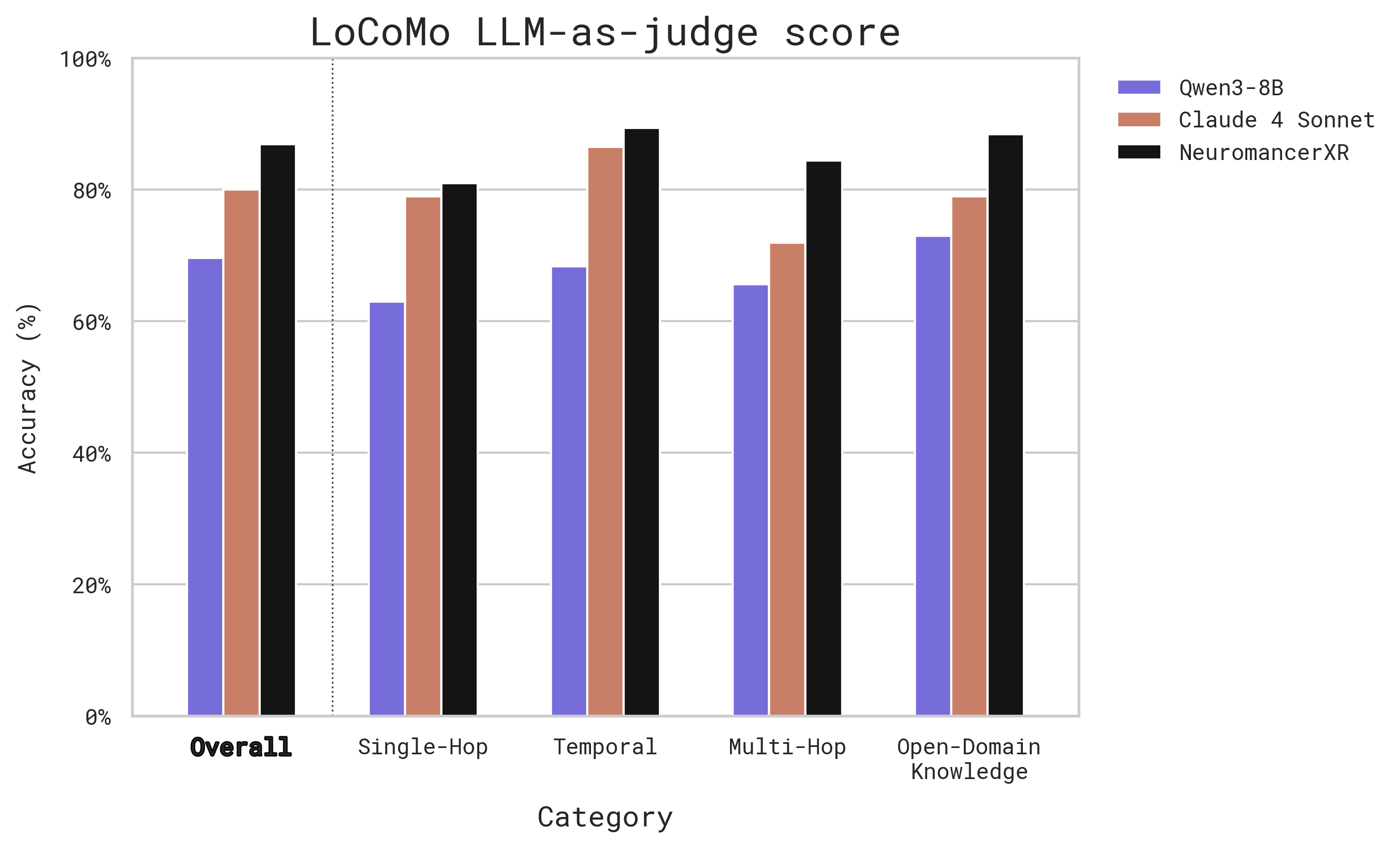 Figure 2 and Table 1 below show the side-by-side comparison of Honcho's performance on LoCoMo when using Neuromancer XR, Qwen3-8B (the base model for our fine-tune) and Claude 4 Sonnet (a frontier model baseline) as the LLM used for the conclusion derivation step.