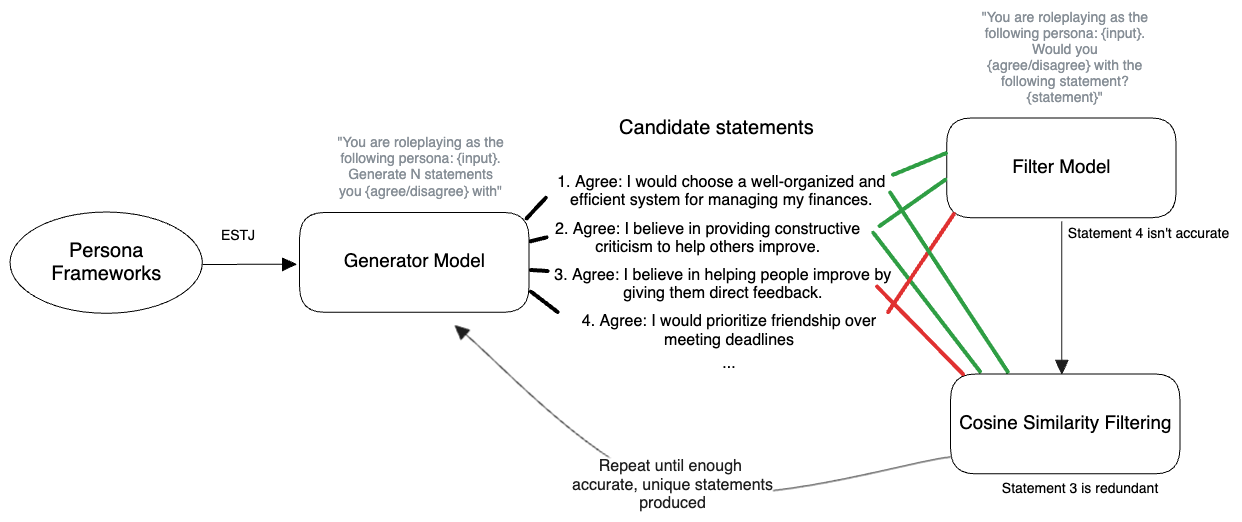 - Agreement Validation: We used a separate filtering model, seeded with the same persona as the generator, to independently verify whether each generated statement would indeed be agreed/disagreed with by the target persona. When generating 20 statements per inference, this stage filtered out about 10-20% of generated statements, helping ensure statement validity. This stage largely follows the approach presented in Anthropic's work on model-written evaluations2.