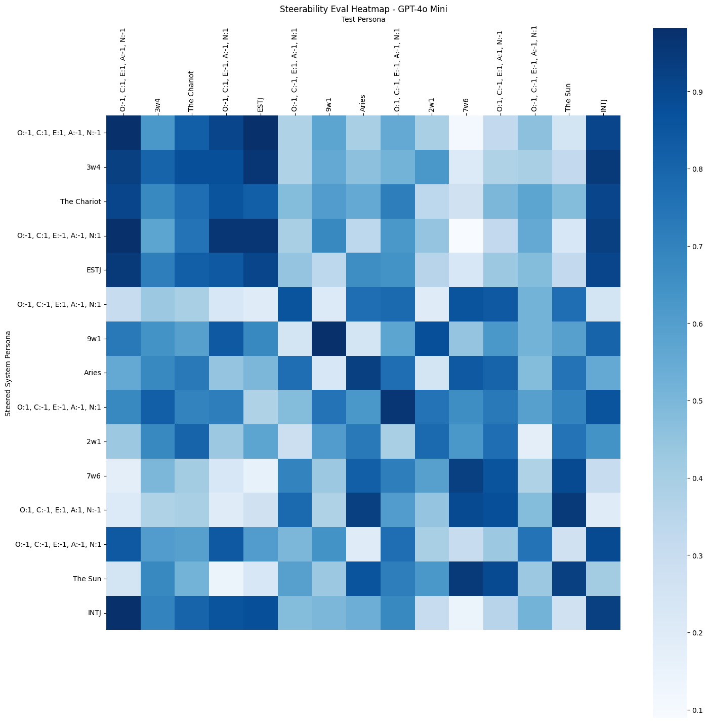 Figure 2 shows the steering scores of GPT-4o Mini as a heat map for a subset of 15 personas in the dataset. Each row represents a steered system , and each column represents a persona test . Cell color indicates raw accuracy from 0 to 1, with the diagonal representing own-persona performance. Figure 3 shows the kernel density estimation (KDE) plot of the average score across persona tests, additionally showing key quantiles.