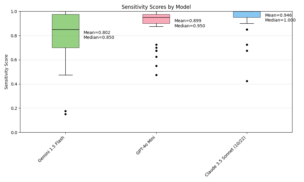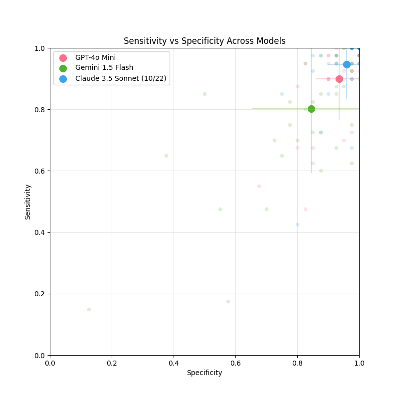 Figure 5. Specificity and sensitivity plots for GPT-4o Mini, Gemini 1.5 Flash and Claude 3.5 Sonnet (10/22).