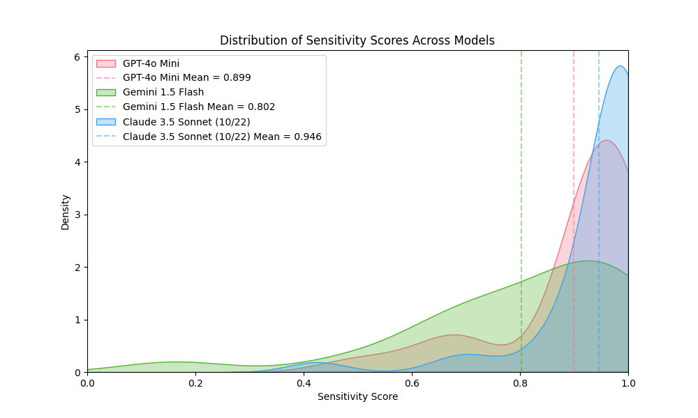 Figure 4. Kernel density estimation of sensitivity scores across personas for GPT-4o Mini, Gemini 1.5 Flash and Claude 3.5 Sonnet (10/22).