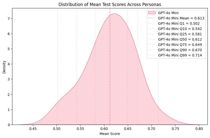 Figure 3. Kernel density estimation (KDE) plot of mean test scores for GPT-4o Mini.